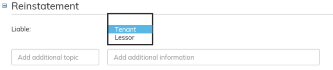 The reinstatement section defines the liable party for reinstating the object of lease.