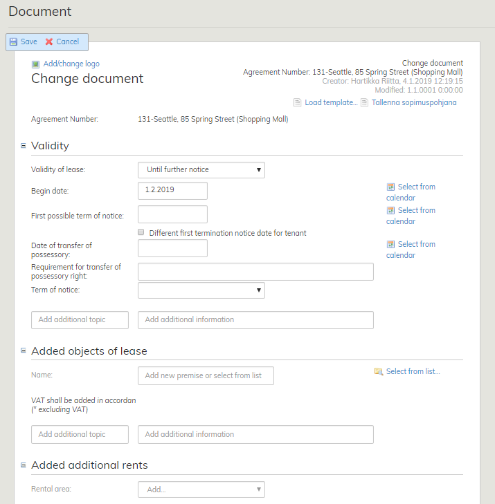 Fastighetsobjektet sägs upp från det gällande avtalet med hjälp av ett ändringsdokument. Efter detta skapas vid behov ett nytt ändringsdokument, som kopplas till det aktuella fastighetsobjektet. I ändringsdokumentet kan du definiera önskade avtalsvillkor. Som standard använder ändringsdokumentet det ursprungliga avtalets höjningsvillkor, villkoren kan dock definieras om. Till ändringsdokumentet kan man lägga till bilagedokument. Med ett ändringsdokument kan man inte ändra det ursprungliga avtalets giltighetsvillkor > detta kräver att ett nytt avtal skapas.
