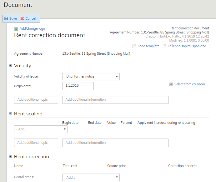 Med ett hyresändringsdokument kan du ändra villkor i anslutning till hyran eller en hyra, som inte är kopplad till hyresjusteringen i avtalet.