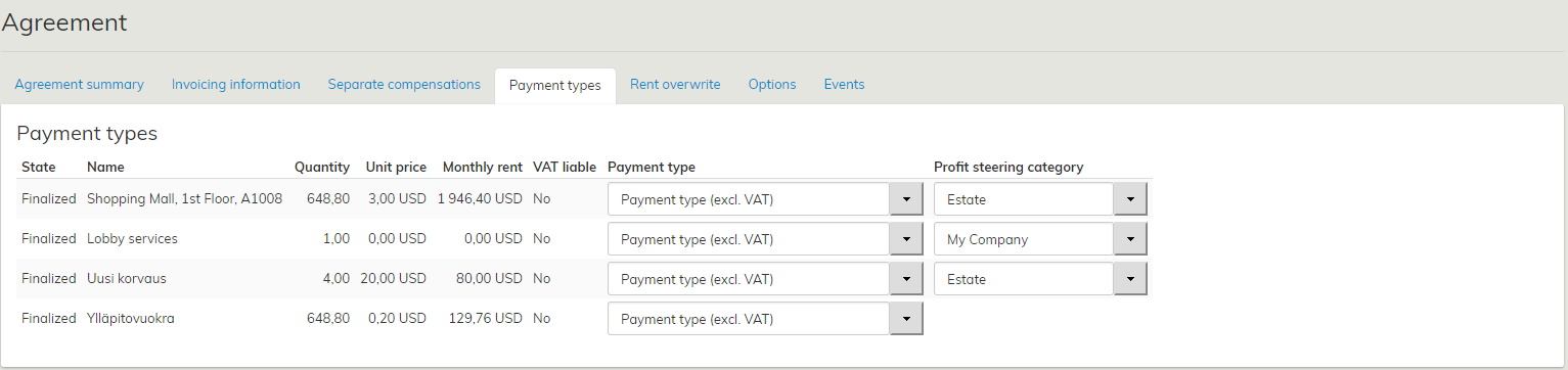 Betalningstyp ska väljas för varje hyresområde och separat ersättning som anslutits till avtalet. Syftet med att fastställa betalningstyperna är att säkerställa att avkastningarna dirigeras rätt i organisationens reskontra.