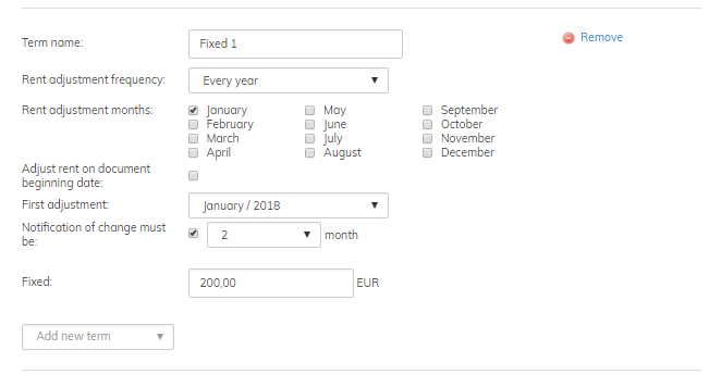If the rent adjustment type is a fixed sum, select the adjustment frequency, adjustment months, and total increase amount.