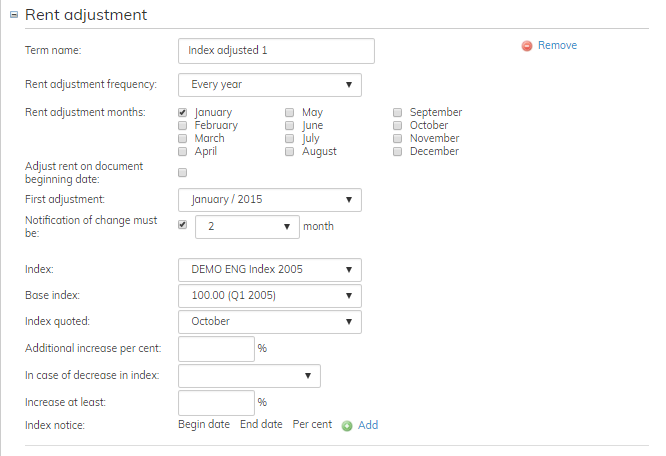 Index | The name of the index used in rent adjustment (e.g. Cost-of-living index) |