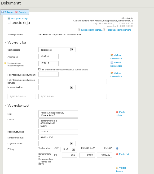 Anna liiteasiakirjan irtisanomisehto alasvetovalikosta. Vuokrantarkistus-kohdassa voidaan valita pohjasopimuksen tarkistusehtoja tai vaihtoehtoisesti luoda uusi ehto liitedokumentille.