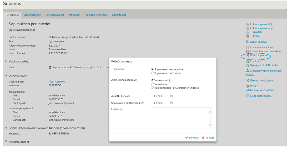 Täytä sopimuksen päättämisen tiedot ja hyväksy päättyminen.