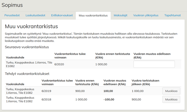 Tehtyjä vuokrantarkistuksia voi muokata ja poistaa Muokkaa-valinnalla. Mikäli laskutusjaksolle on kuitenkin jo luotu laskutusaineisto, kyseistä laskutusjaksoa koskevia vuokrantarkistuksia ei voi enää muuttaa.