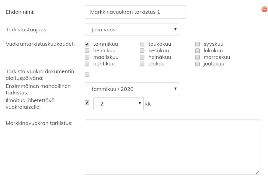 Määritä tarkistustaajuus alavetovalikosta, vuokrantarkistuskuukaudet, ensimmäinen tarkistus ajankohta sekä asiakkaalle lähtevä ilmoitusajankohta.