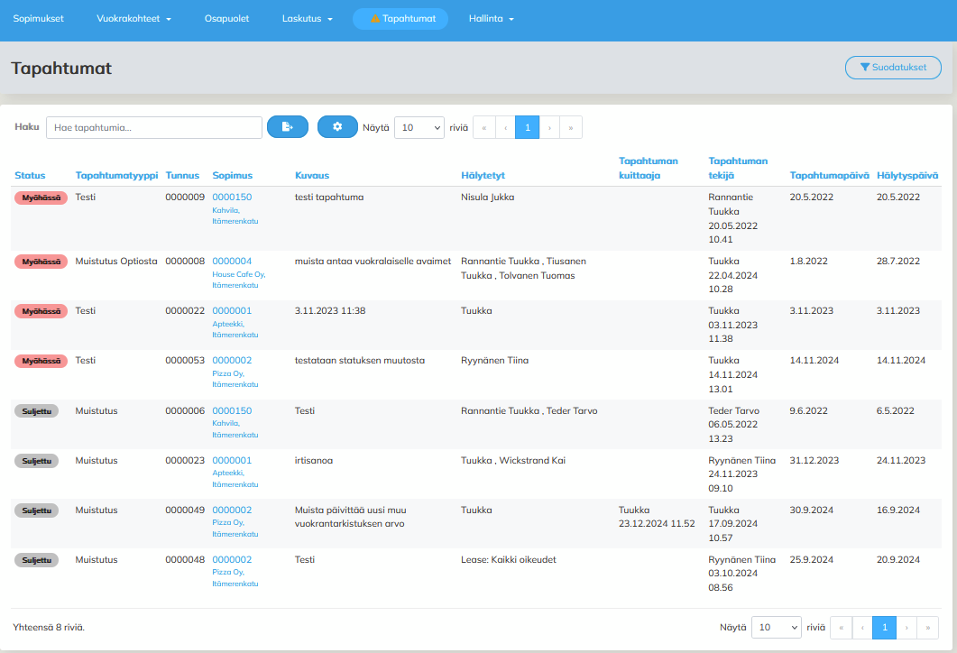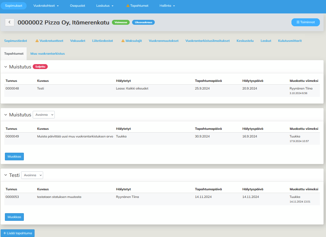 Käyttäjä voi luoda sopimukselle erityyppisiä tapahtumia vapaamuotoisesti. Tapahtumien tyyppejä hallinnoidaan hallintavalikon kautta.