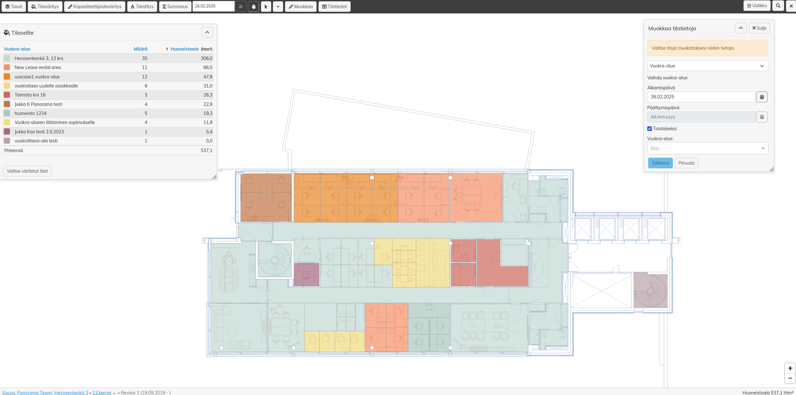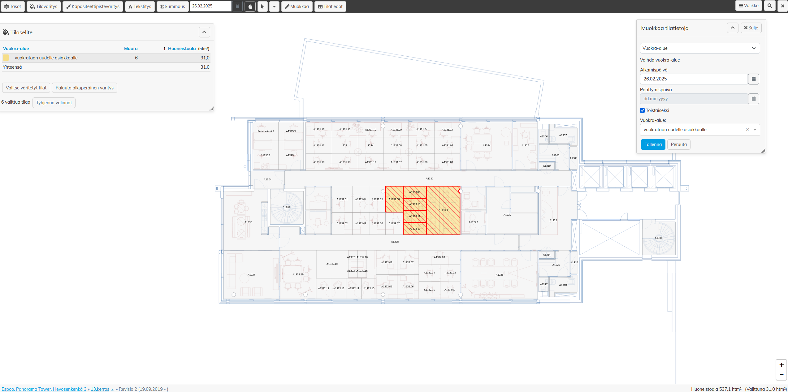 • Väritetään pohjakuvassa tilat, joissa on valittuun päivään nähden voimassaoleva vuokra-alue