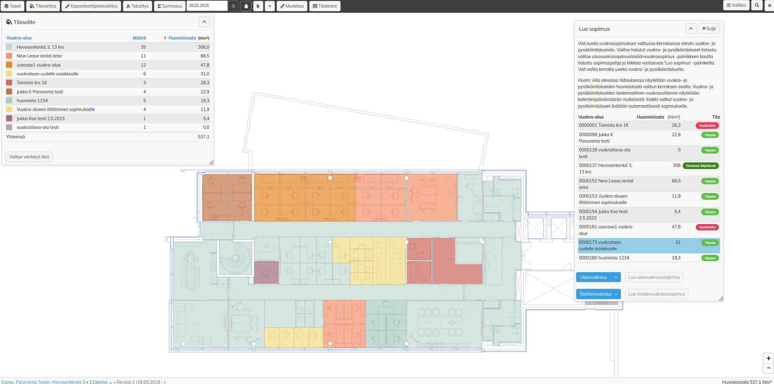 • Väritetään pohjakuvassa tilat sopimuksittain, joiden voimassaolevaan vuokra-/pysäköintialueen tilalinkkiin liittyy ulosvuokraussopimus