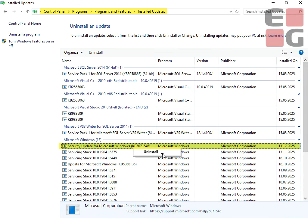 December 2025 Windows security update (KB5071546, KB5071544, KB5071543)