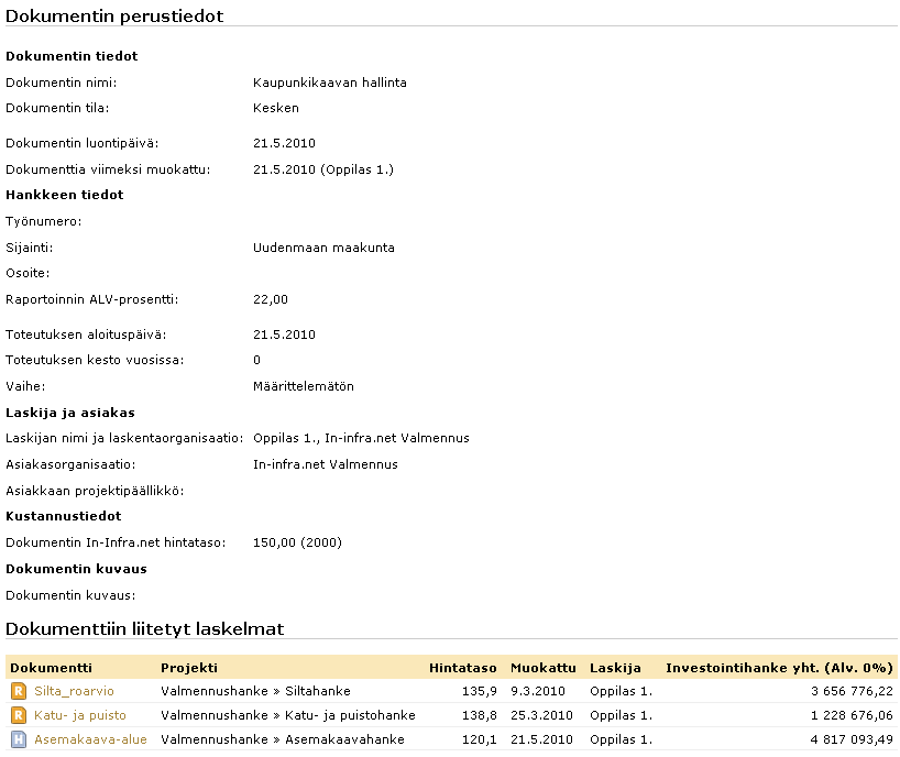 Dokumenttinäkymässä esitetään Arena-dokumentin hankehallinnan perustiedot ja siihen liitetyt laskelmat. Tämä näkymä on käytännössä yleiskoonti hankkeesta, klikkaamalla dokumentin nimeä pääsee suoraan Rola tai Hola dokumenttiin.