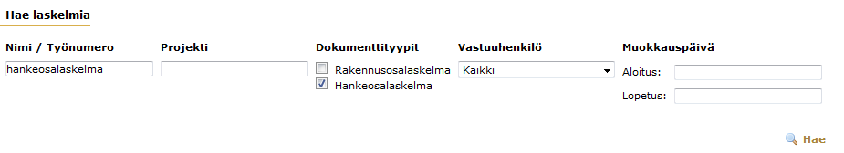 Laskelmia voi hakea nimen/työnumeron, projektin nimen, tyypin, omistajan tai muokkausajankohdan perusteella. Järjestelmä suorittaa haun kun käyttäjä painaa "Hae"-painiketta. Laskelman ja projektin nimen mukainen merkkijonohaku kohdistuu kohteisiin, joihin hakijalla on käyttöoikeudet.