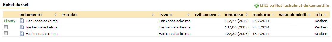 Oletusarvoisesti Arenassa on aluksi esitettynä hakutuloksissa kaikki laskelmat joihin käyttäjällä on oikeus. Kun tarkennettu haku onnistuu, Arena tuo listan taulukkoon laskelmat, jotka täyttävät kaikki hakuehdot. Halutut laskelmat rastitetaan ja liitetään Arena- dokumenttiin klikkaamalla "Liitä valitut laskelmat dokumenttiin". Kun jokin laskelmaa liitetään Arenaan rivin kohdalle tulee Liitetty --teksti.