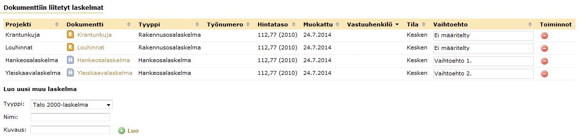 Kuva 11. Hakutulokset joissa on esitettynä jo liitetyt laskelmat sekä muut hakuehtojen mukaiset laskelmat