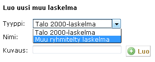 Muu laskelma syötetään järjestelmään valitsemalla kuvan 5 mukaisesta valikosta muu laskelma ja syöttämällä sen jälkeen laskelmalle nimi ja kuvaus. Kun tiedot on syötetty voidaan laskelman perustietoja ja kustannuksia päivittää valitsemalla liitetyistä laskelmista äsken luotu --klikkaamalla laskelman nimi linkkiä.
