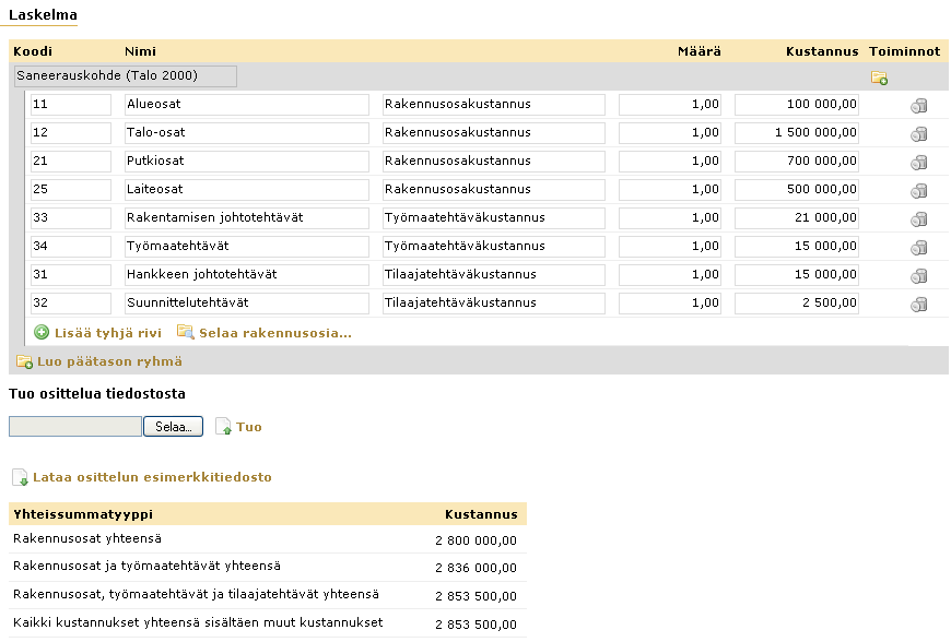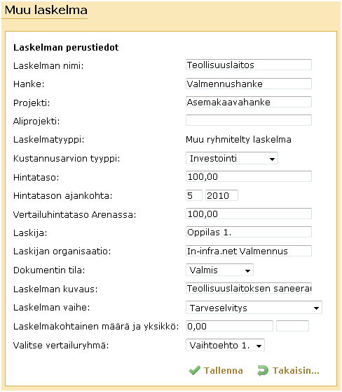 Muun kuin Fore --laskelman kustannukset syötetään tässä vaiheessa käsin. Laskelman hintatasoksi syötetään laskelman hintataso (esim. Talo-2000 --laskelman tapauksessa, 1/2008 vastaa Haahtelan Talonrakentamisen Kustannustiedon kustannustasoa 85). Vertailuhintataso Arenassa --kohtaan syötetään vastaava taso kuin dokumenttiin linkitettyjen Fore --laskelmien esim. hintataso 150 (11/2008) vastaa vertailuhintatasoa 90 (11/2008, Haahtela, Talonrakentamisen Kustannustieto).