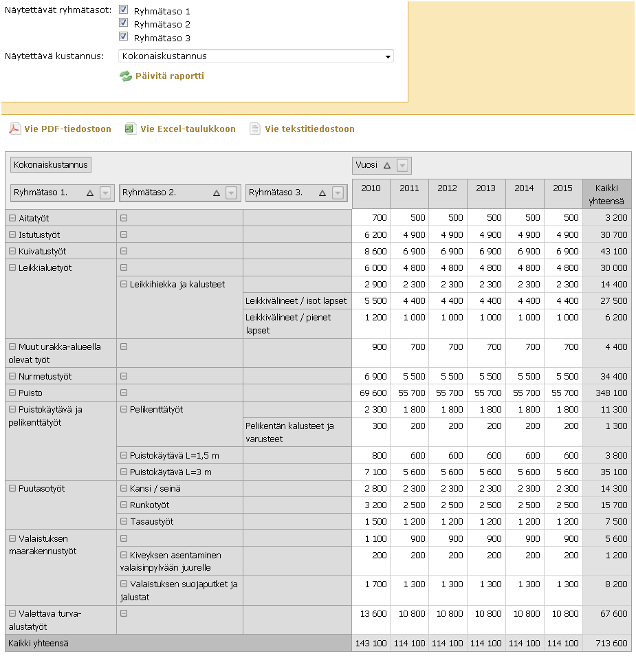 Raportti Kustannusten budjetointi ryhmittäin esittää hankkeen budjetoinnin jakaantumisen vuositasolla budjetointijaksolle euroina.