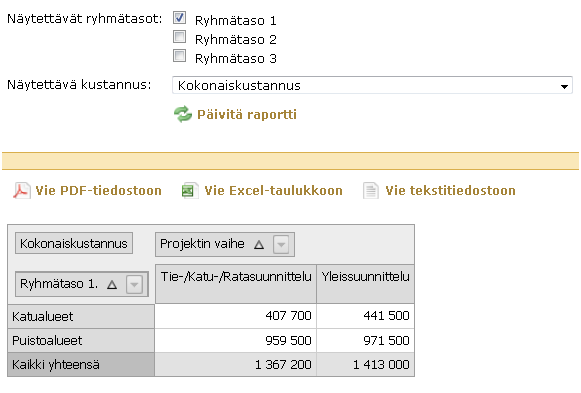 Raportti Kustannukset ryhmittäin ja vaiheittain kuvaa käyttäjälle hankkeen kustannukset hyödyntäen laskelmien yhtenäistä ryhmittelyä per hankkeen suunnitteluvaihe.