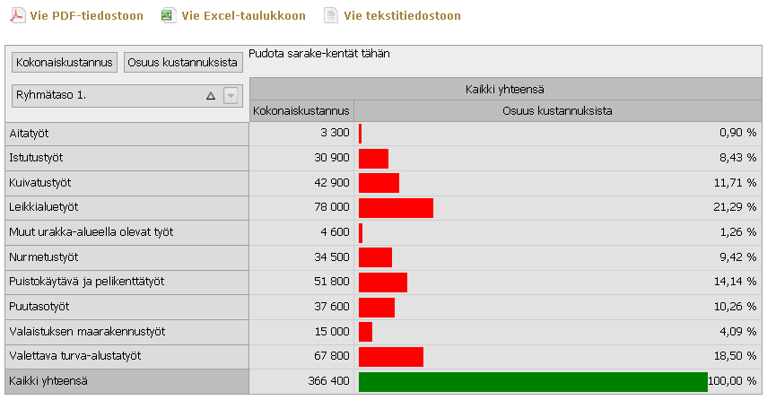 Raportti Kustannukset ryhmittäin kuvaa koko hankkeen kaikki laskelmat ryhmiin jaotelluin kustannuksin.