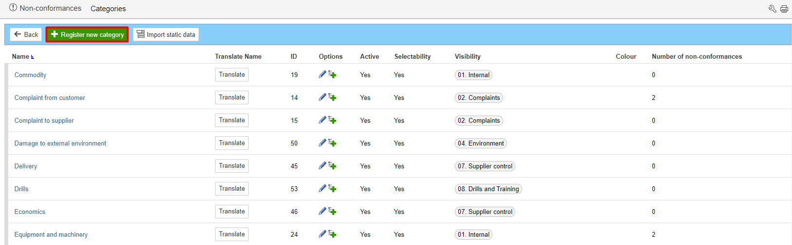 Note: It is not possible to delete a category if there are nonconformities registered for them.