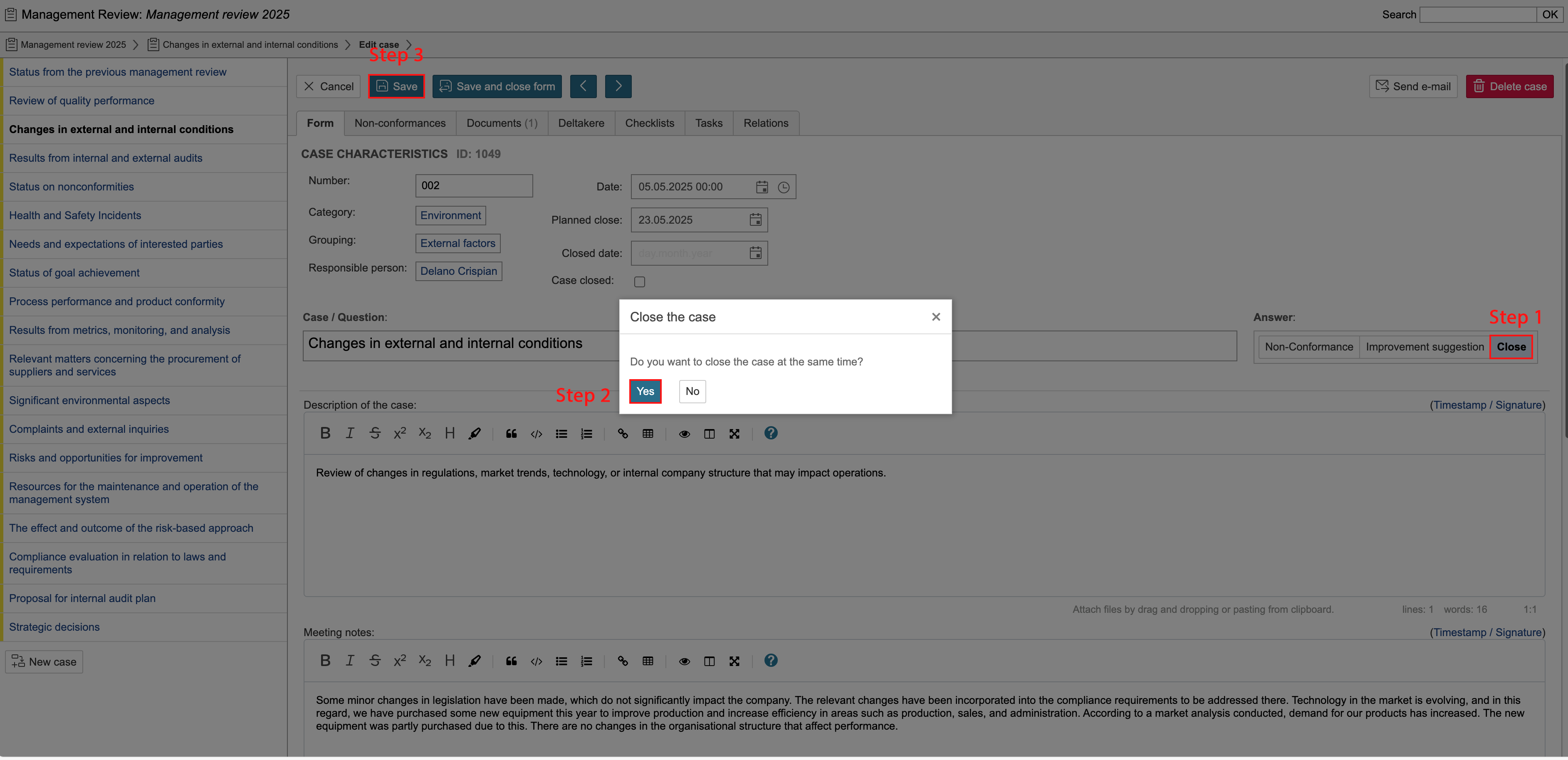 If the case has been completed and should be closed, click Close. A confirmation prompt will appear. To close the case, click Yes and then Save. Follow steps 1–3 as illustrated in the screenshot.