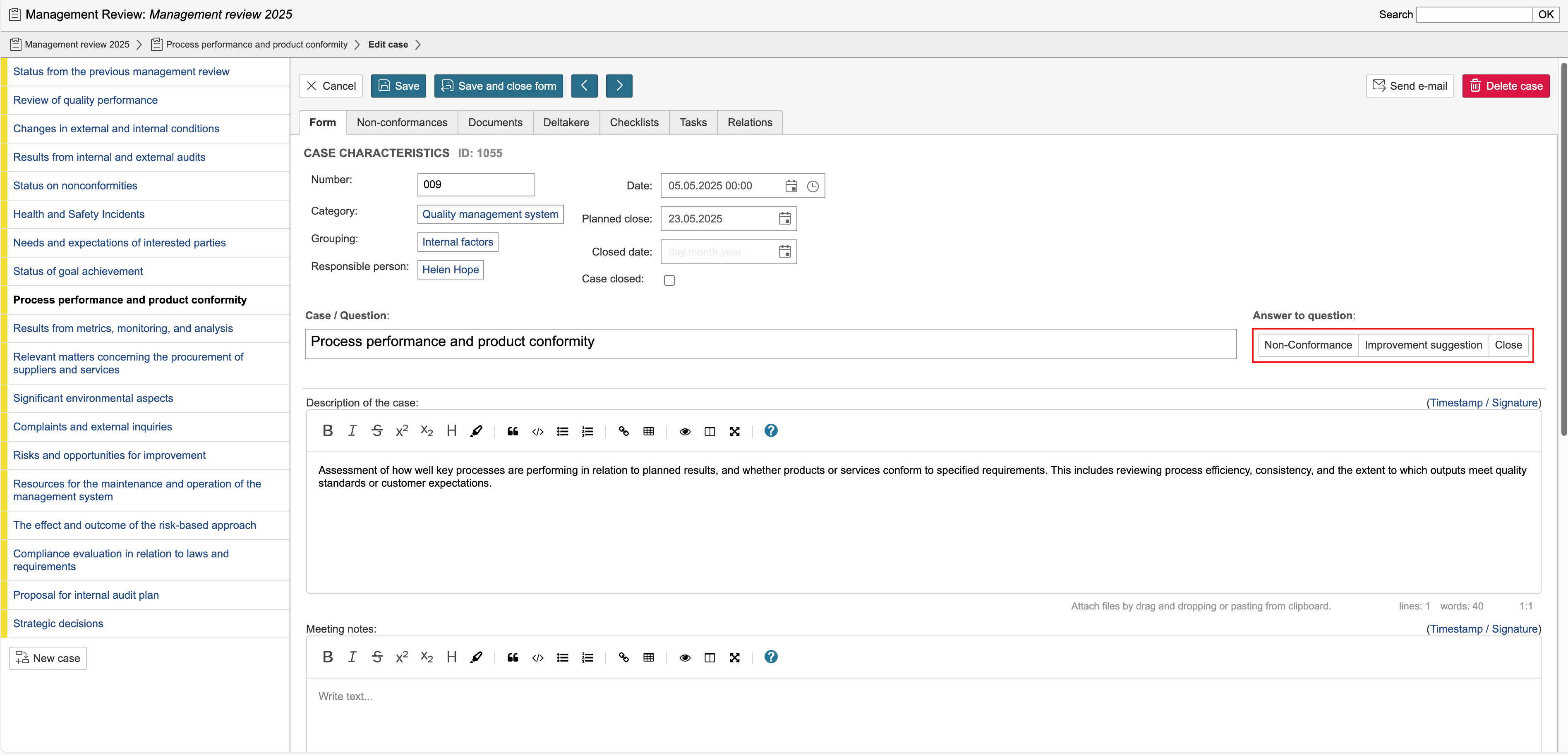 You can configure answers to be used in protocol cases. These answers can have no action, an action that closes the case, or an action that creates a case in the non-conformance module. The answers are configured in the control panel. In the example on this page, three alternatives are used: Non-Conformance, Improvement Suggestion, and Close.