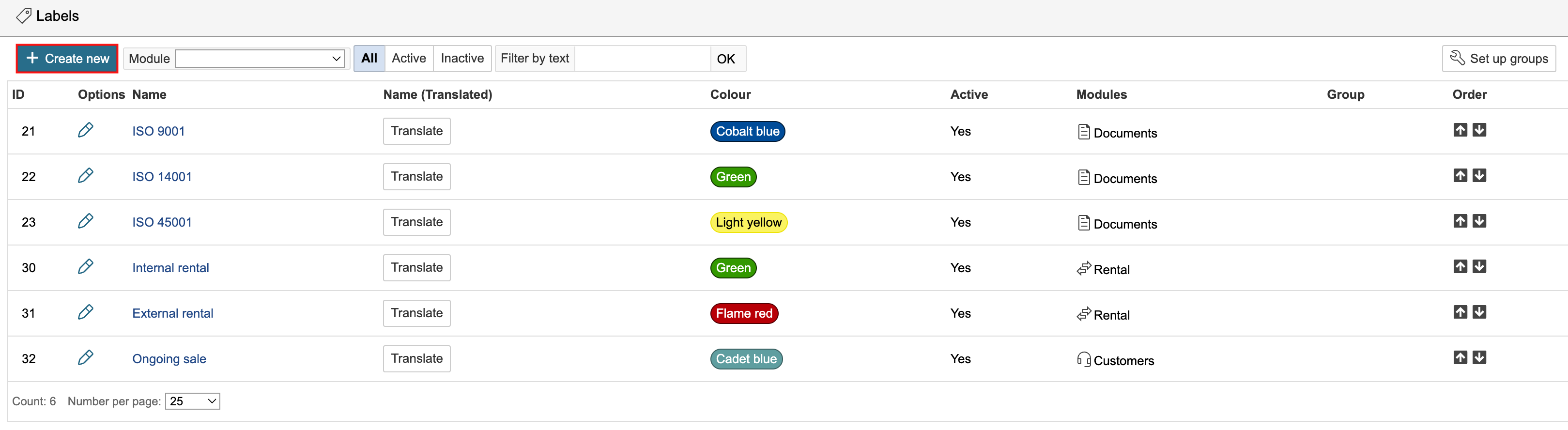 2. The page displays labels from all modules in the system. To create a new one, click Create new.