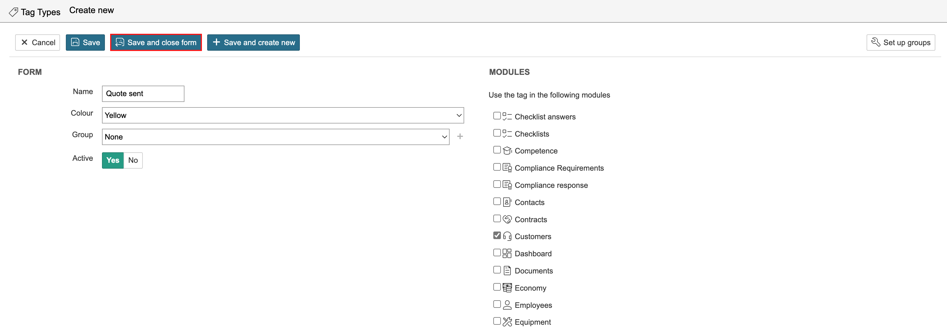 3. Enter the name of the label, select its colour, and choose the modules in which the label should be used. The same label can be used across multiple modules. Select the modules in which the label should be available by ticking the checkbox for the modules on the right-hand side of the page. Click Save and close form when you are finished.