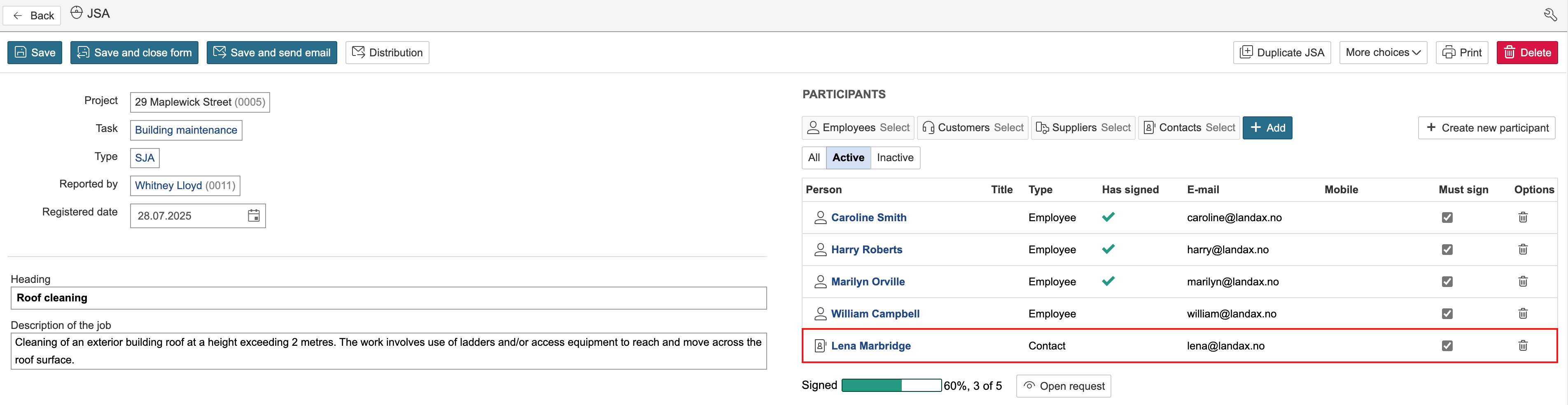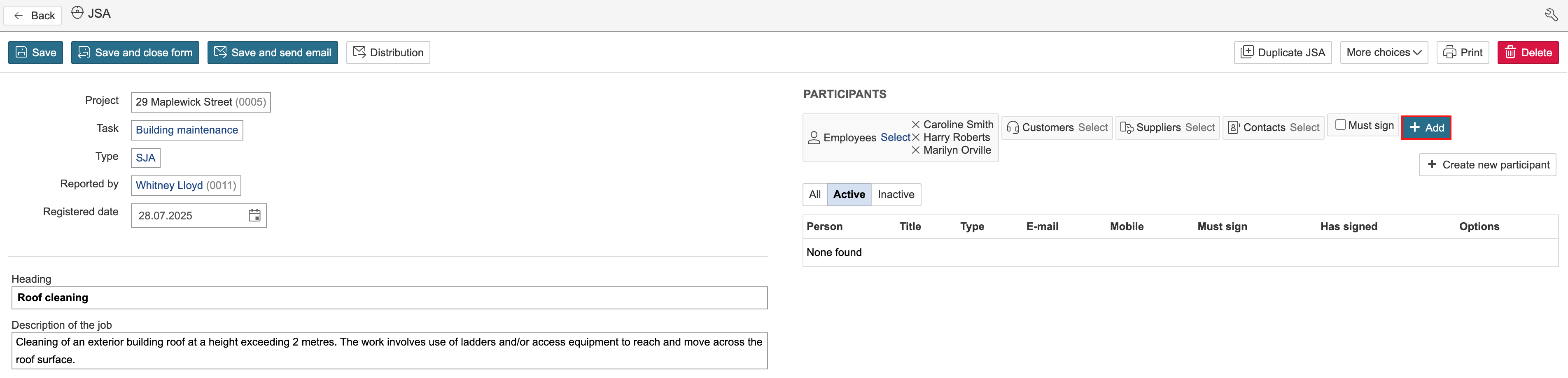 You can add coworkers, customers, suppliers, and contact persons as participants. Participants can also be created directly from a JSA.