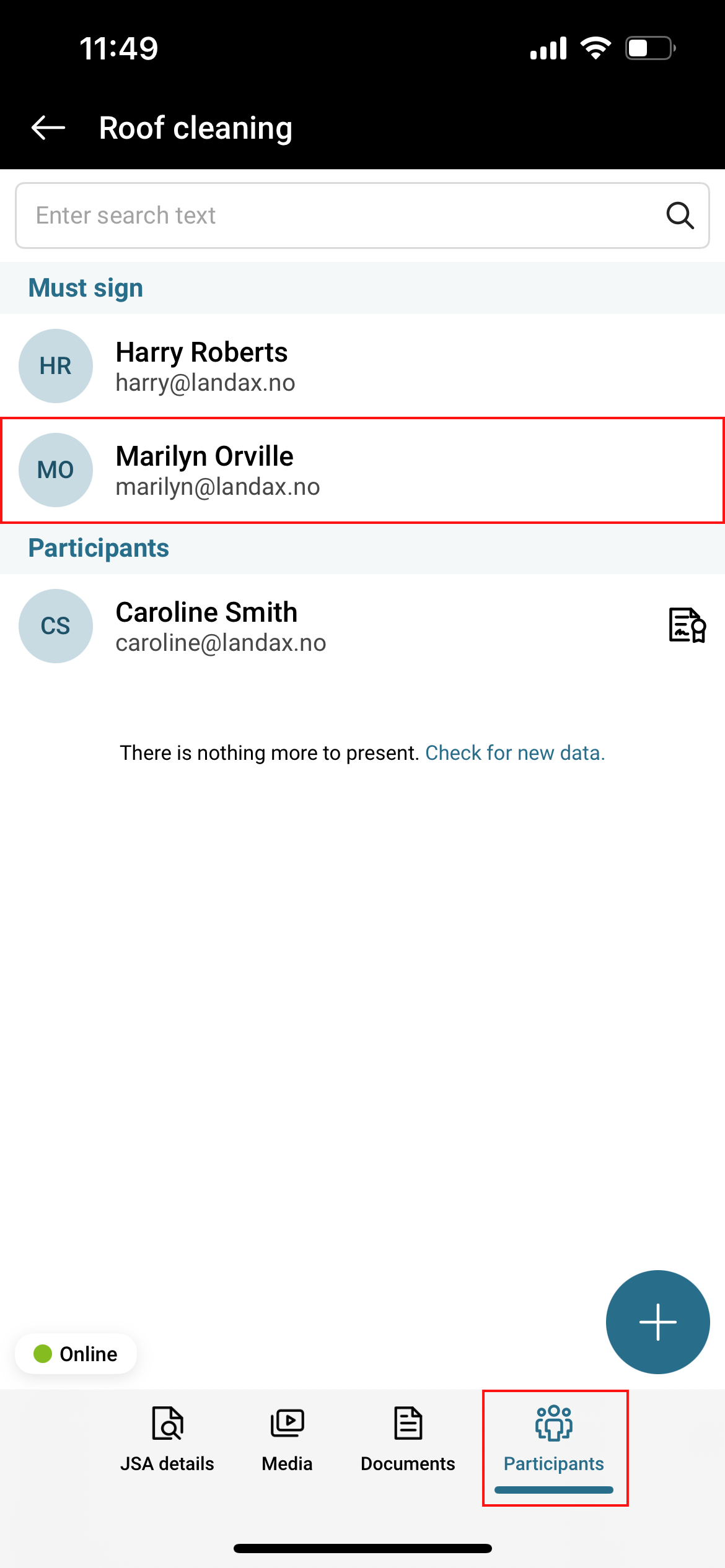 Info: You can also open the 'Participants' tab at the bottom of the screen and sign the JSA from there. Go to 'Sign with touch' further down the page to view the guide.