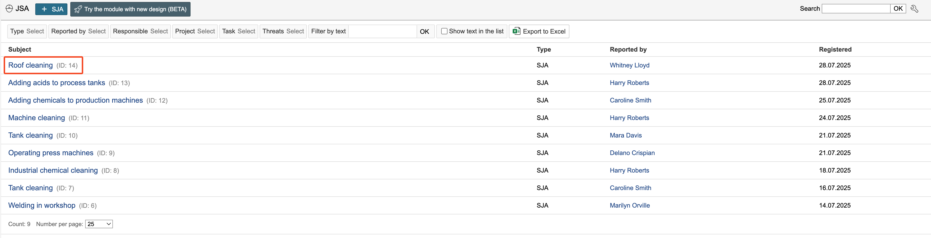 1. To sign a JSA in the web browser, go to the JSA module and click on the JSA to be signed.