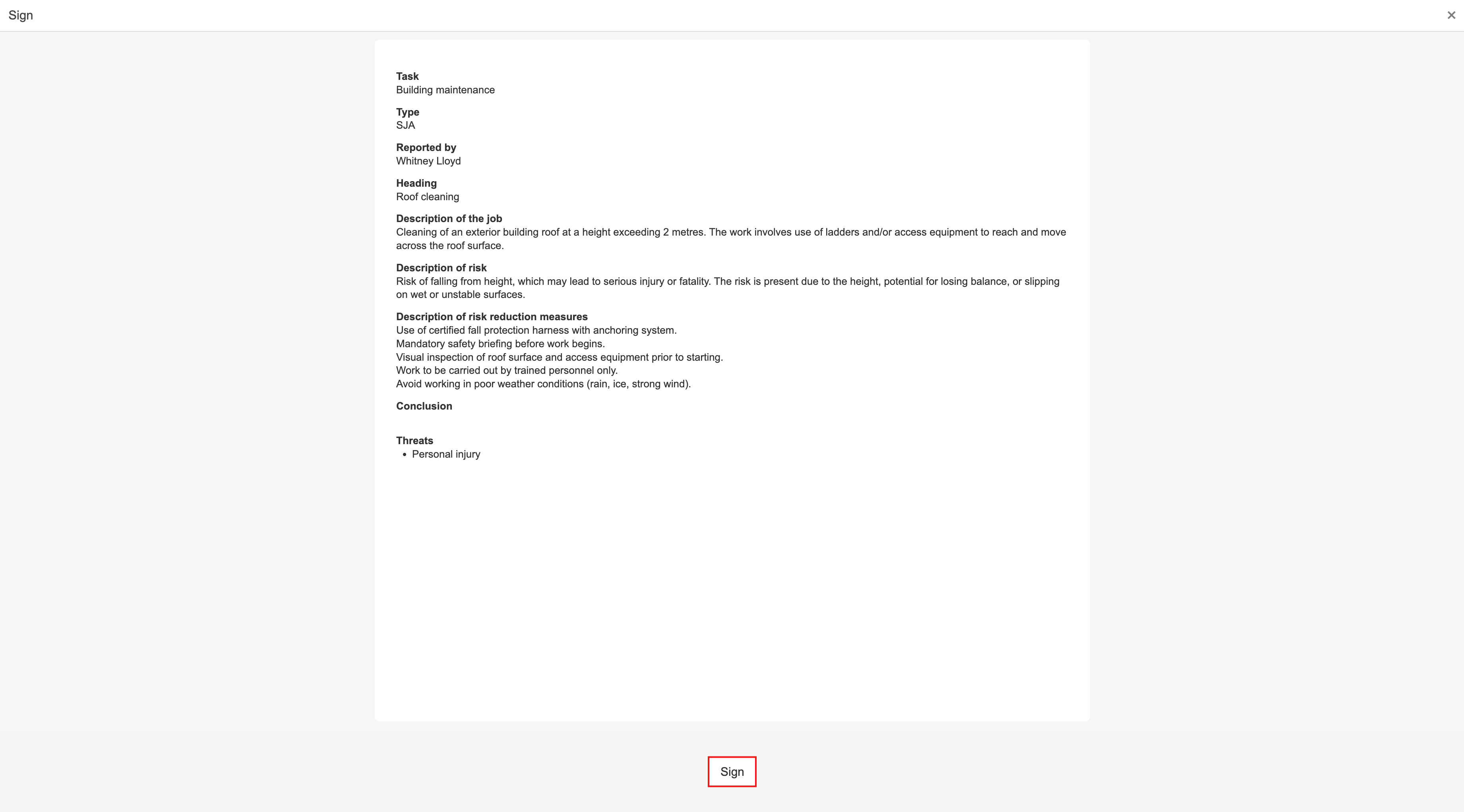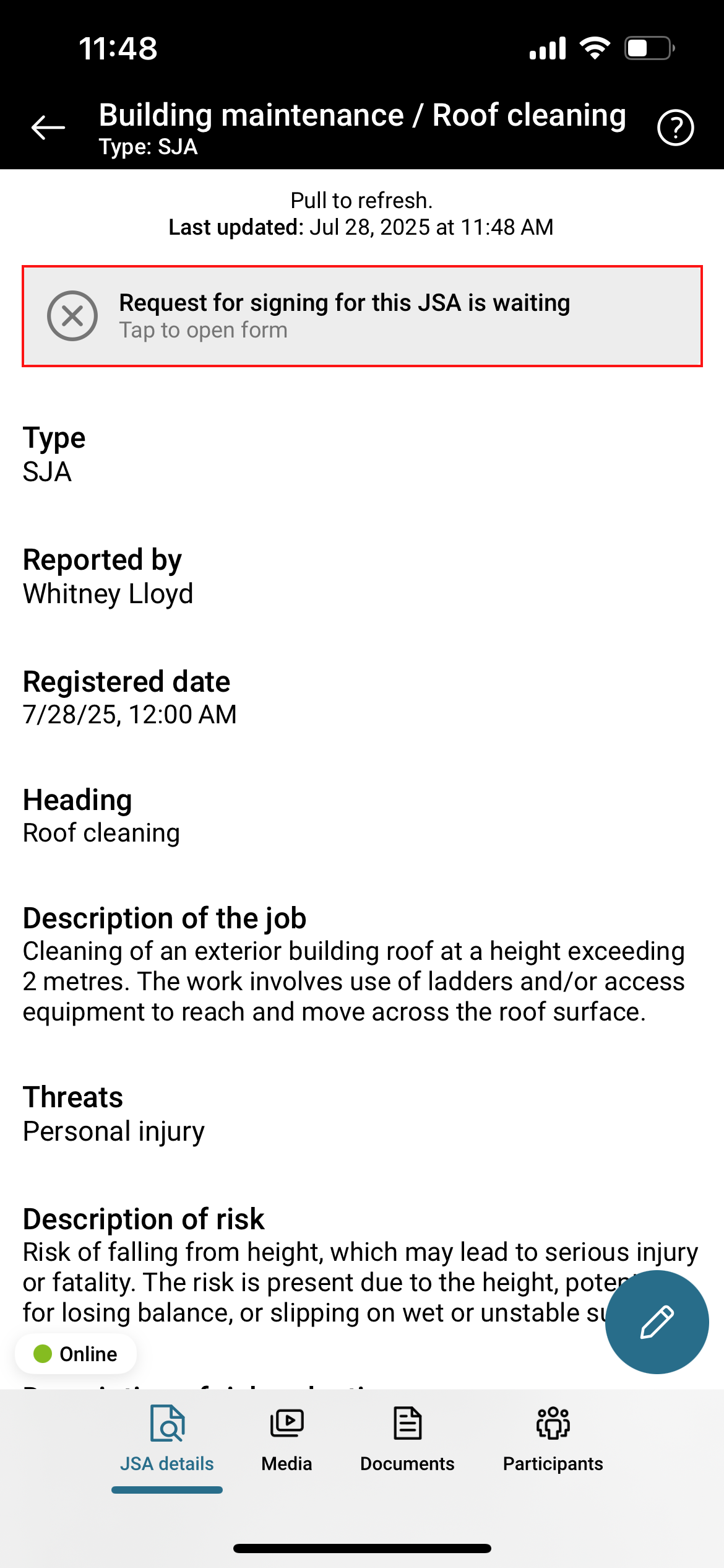 2. When you open the JSA assigned to you for signing, the message 'Request for signing for this JSA is waiting' is displayed at the top. Tap the button to read and sign it.