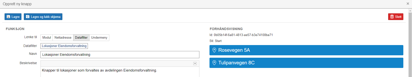Opprett og lag datafilteret på kontrollpanelet, velg Datafilter og fyll inn navn for knappen. Navnet på lokasjonen er navnet i knappen og lokasjons-symbolet illustrerer at knappene lenker til registreringer i lokasjonsmodulen.