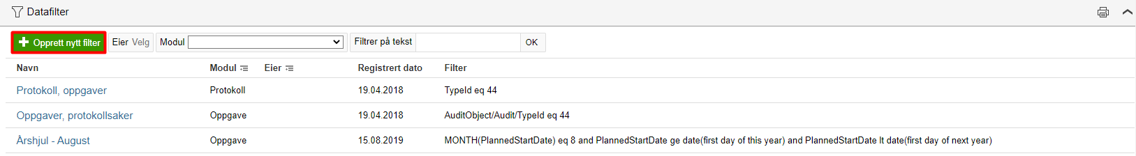 Datafilter er en modul som gir deg anledning til å opprette faste filtere og spørringer mot alle data i systemet (alle data som er tilgjengelig gjennom vårt offentlige API). Denne modulen er en avansert modul, som krever god teknisk kompetanse for å bruke. Foreløpig kan den brukes i gadget for avviksliste basert på filter, samt som et fast filter ved uttak av data gjennom API ("filterid"-parameter i URL).