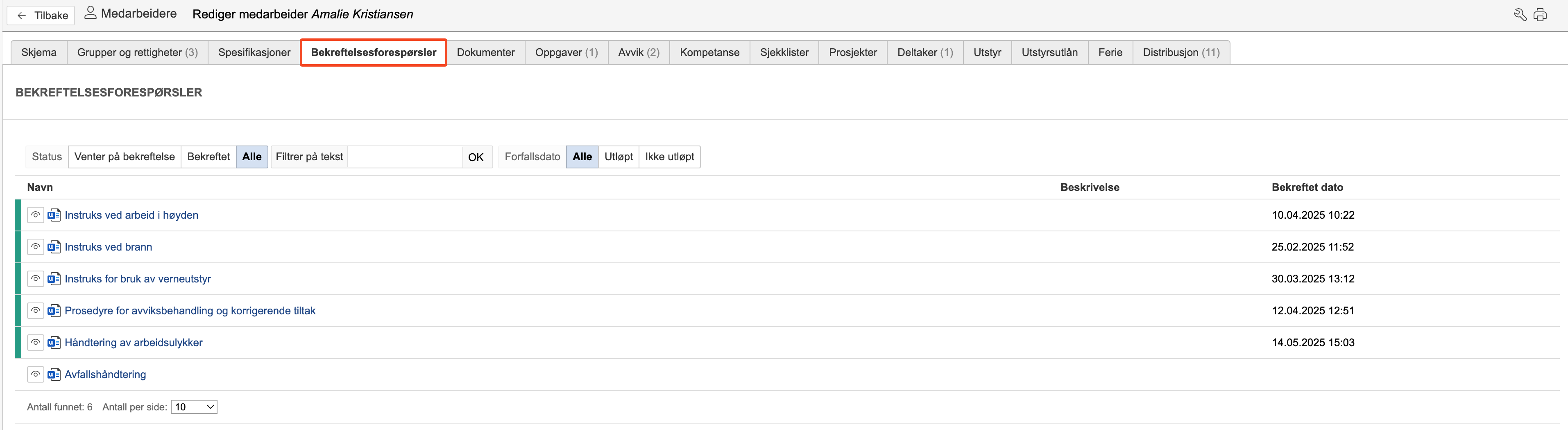 - Fane for lesebekreftelse: I medarbeider-modulen har nå hver bruker en egen fane som viser forespørsler om lesebekreftelse på dokumenter som brukeren har fått tilsendt. Forespørslene som er markert med grønt er de som er bekreftet lest og forstått.
