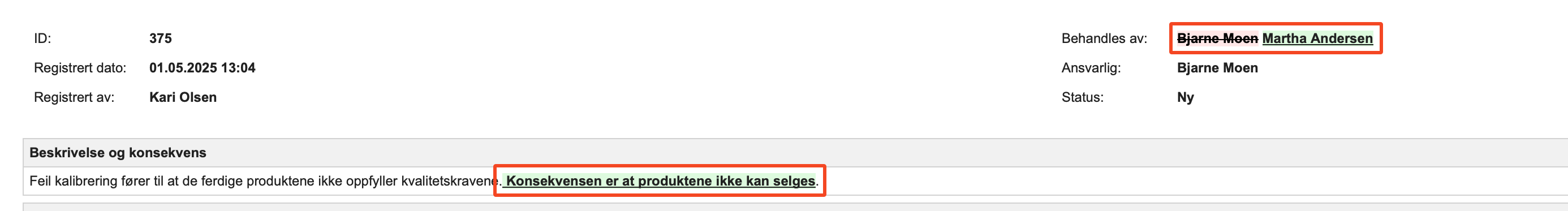 - Diff. visning: I flere moduler kan du nå skru av og på diff. visning i e-post-utsendelse. Diff. visning i eposter viser endringene som er gjort på registreringen det varsles om. Det som er markert i rødt er tidligere innhold, og det som er markert i grønt er nytt eller oppdatert innhold.