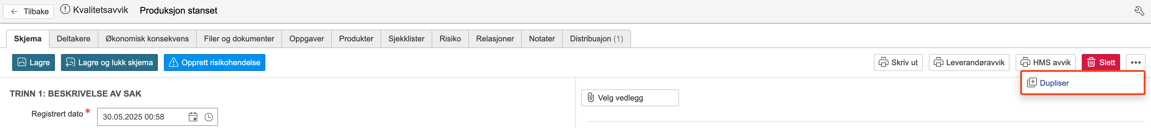 - Duplisere avvik: For å duplisere et avvik, åpne avviket du skal duplisere, hold musepekeren over prikkene øverst til høyre og klikk Dupliser.