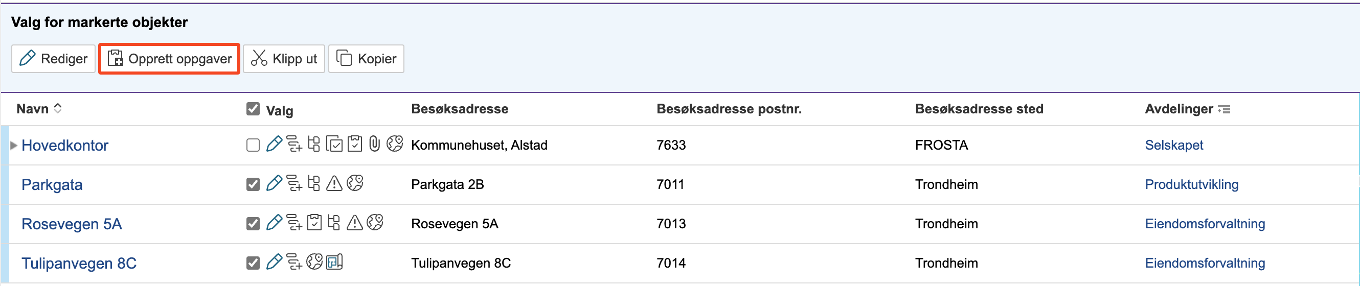 - Masse-opprettelse av oppgaver: Du kan opprette samme oppgave på lokasjoner, utstyr eller avdelinger samtidig. Det gjør du ved å markere lokasjonene, utstyr eller avdelingene i oversikten og trykke "Opprett oppgaver".