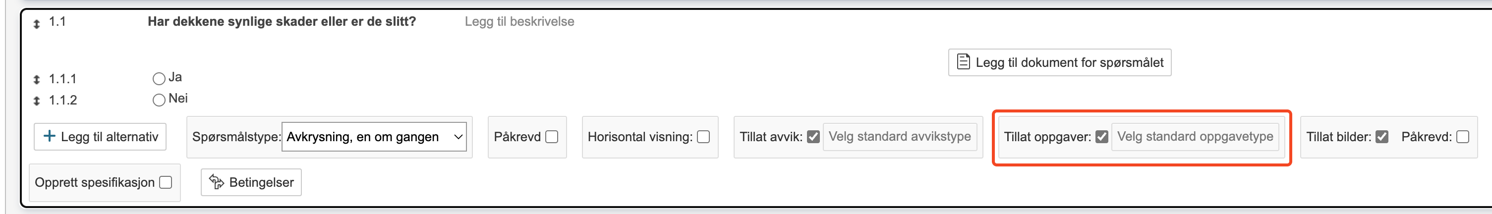 - Opprett oppgave i sjekklistebesvarelse: Du kan tillatte opprettelse av oppgaver direkte i en sjekklistebesvarelse. Her kan du også velge en standard oppgavetype.