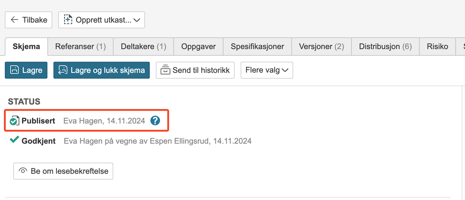 - "Publisert av" på dokumenter: Navn og dato for når og av hvem dokumentet ble publisert vises i skjemaet, og kan brukes som flettefelt. Dato og navn for publisering kan være forskjellige fra dato og navn for godkjenning i de tilfeller der dokumenter ikke godkjennes og publiseres samtidig.
