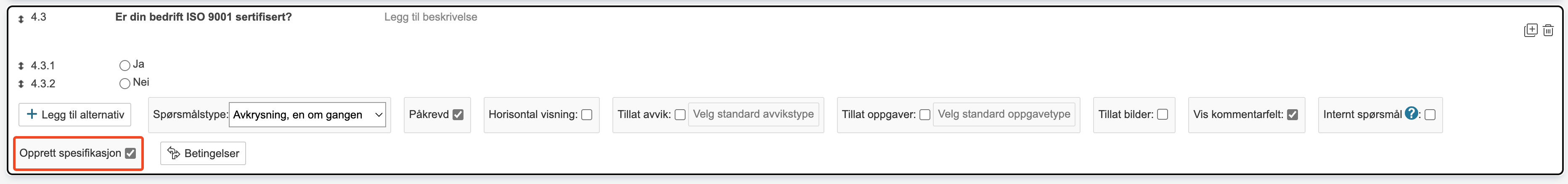 - Spesifikasjoner i sjekkliste: Du kan opprette spesifikasjoner automatisk på leverandører og kunder basert på hva som besvares i sjekklisten. Dersom en sjekkliste knyttes til eller fylles ut av en leverandør eller kunde (Be om svar) opprettes svaret, som i dette tilfellet er "Ja" eller "Nei", som en spesifikasjon på leverandøren eller kunden. Dette kan brukes i for eksempel en leverandørevaluering.