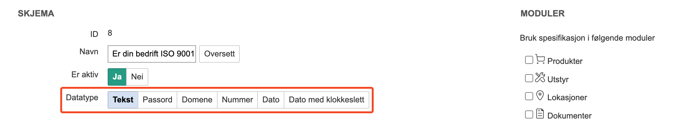 - Datatype på spesifikasjoner: Du kan velge hva slags datatype en spesifikasjon skal være. Det gjør du ved å gå til Kontrollpanelet → Spesifikasjoner og rediger eller opprett spesifikasjon.