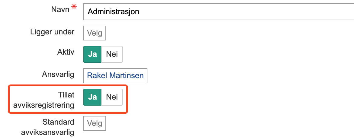 - Tillatt avviksregistrering på avdeling: Du kan velge om en avdeling skal være mulig å velge ved registrering av avvik. Tilfeller der du kan bruke dette valget er der avvik for eksempel kun skal registreres på underavdelinger i avdelingsstrukturen. Da kan du deaktivere den muligheten på overliggende avdelinger.