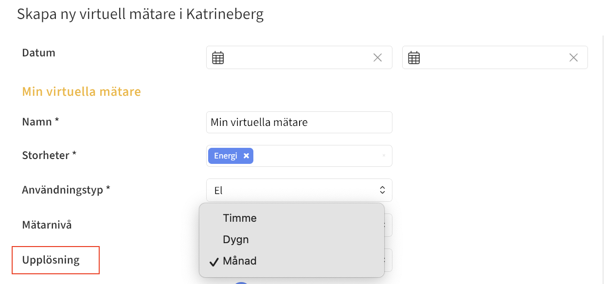 I uppskapande av en virtuell mätare i Mestro Portal så finns det ett val för upplösning. Här kan du välja mellan Månad, Dag eller Timma. Detta bestämmer helt enkelt vilket upplösning din data som beräknas fram av den virtuella mätaren kommer ha i våra rapporter.
