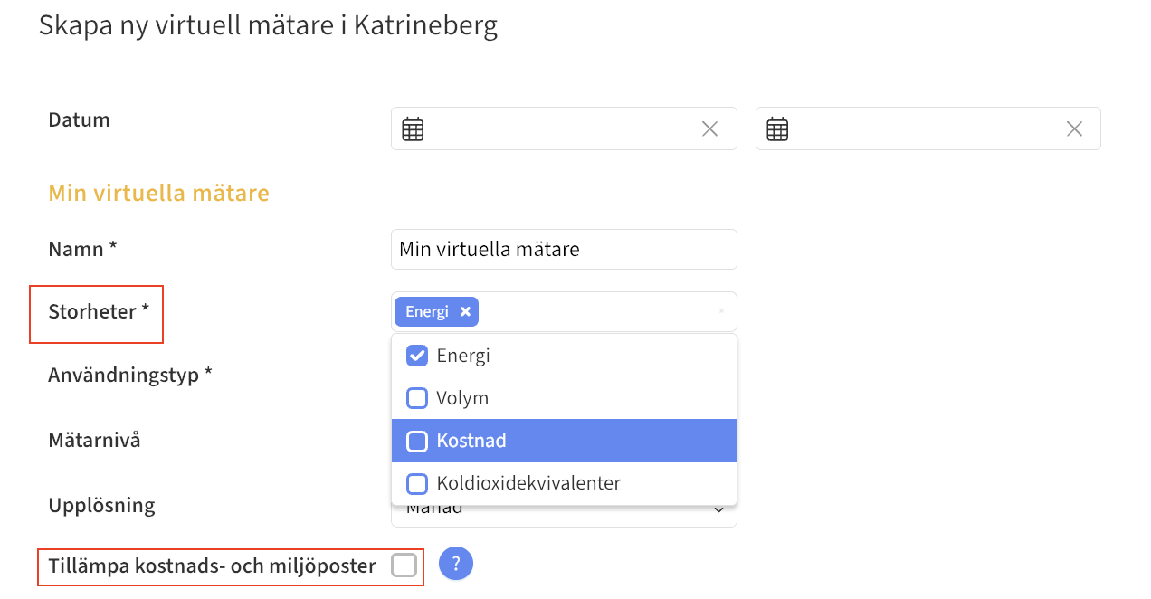 Vill du "ta med dig" kostnaden från de ingående mätarna så behöver du klicka i Kostnad under Storheter under uppskapandet eller redigeringen av en virtuell mätare. Har dina ingående mätare flera olika kostnadsposter (som till exempel både nätkostnader och handelskostnad eller både rörlig och fast) och du vill att de uppdelningarna ska behållas till den virtuella mätarna behöver du även klicka i Tillämpa kostnads och miljöposter.