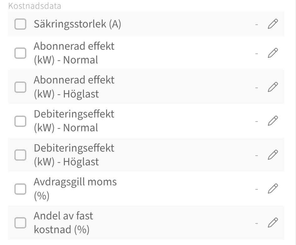 För att Mestro Portal ska räkna ut korrekt kostnad behöver du registrera vissa data på mätarnivå beroende på vilket avtal som gäller just den mätaren/fastigheten. Följande kostnadsposter är tillgängliga: