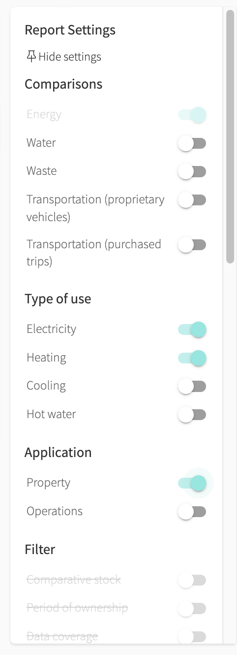 ATTENTION! If you have either "Property" or "Operation" clicked in your settings without having tagged meters, you will not be able to see any consumption at all. Therefore, make sure to click out of these fields.