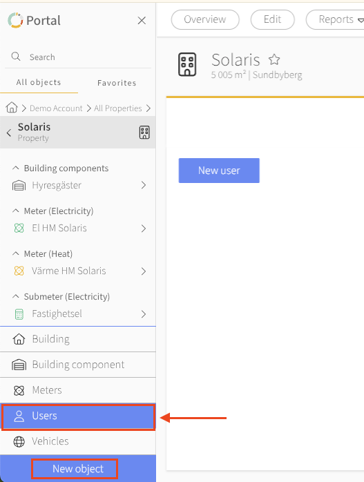 Alternative 2 is to use the object creator. In the lower lefthand corner, click New object and pick User. Node tree position does not affect the creation of users using this alternative. It is possible to create an Admin-level user with access to your entire portfolio when standing on a meter node.