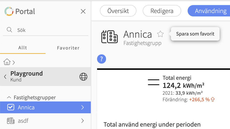 TIPS: Genom att markera en grupp eller fastighet och sedan klicka på stjärnan bredvid fastighetsnamnet i vyn så sparas denna till fliken Favoriter så att du alltid har snabb tillgång!