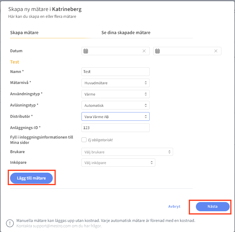 Tips! Om du lägger upp fler mätare på samma gång, kan du välja att förhandsgranska innan du skapar dessa. Välj då att trycka på Se dina skapade mätare längst upp till höger. Då får du en lista på alla mätare du lagt upp, och kan lätt se ifall du missat någon. Det är även denna vy du ser när du klickar på Nästa.